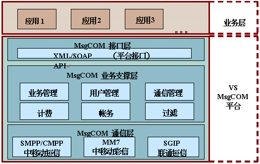 MsgCOM是Voicesoft專門為移動(dòng)內(nèi)容提供商或企業(yè)開發(fā)的移動(dòng)通信平臺(tái),它支持SMS短信(SMPP/CMPP)、MMS彩信(MM7)、聯(lián)通短信(SGIP)等等通信協(xié)議,同時(shí)提供對(duì)各種業(yè)務(wù)支持的業(yè)務(wù)支持層,為各種業(yè)務(wù)提供了簡單靈活的業(yè)務(wù)二次開發(fā)接口;MsgCOM屏蔽了所有的底層通信協(xié)議和復(fù)雜的業(yè)務(wù)管理、計(jì)費(fèi)管理、用戶管理等等內(nèi)容,為用戶提供了一個(gè)簡單、高層、靈活的業(yè)務(wù)定制接口,便于內(nèi)容提供商和企業(yè)定制自己的移動(dòng)應(yīng)用,MsgCOM將具有廣泛應(yīng)用市場,歡迎各大系統(tǒng)集成商、移動(dòng)內(nèi)容提供商、知名企業(yè)來電來函進(jìn)行合作。