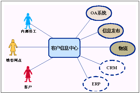 客戶(hù)信息中心有兩個(gè)層次的含義,首先它是一個(gè)信息中心,它應(yīng)該可以訪(fǎng)問(wèn)到后臺(tái)現(xiàn)有的各種系統(tǒng),如OA系統(tǒng)、信息發(fā)布系統(tǒng)、物流系統(tǒng),同時(shí)它還應(yīng)該有良好的擴(kuò)展性,可以和未來(lái)的其它系統(tǒng)相銜接,比如CRM系統(tǒng)、ERP系統(tǒng)相接;其次它是一個(gè)圍繞客戶(hù)的信息中心,它應(yīng)該為客戶(hù)提供方便的信息交流手段,這就要求我們能夠通過(guò)多種媒介實(shí)現(xiàn)信息交互。