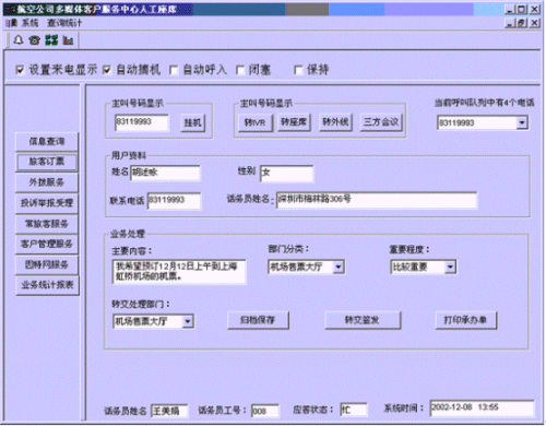 。。客戶打入電話后,當(dāng)系統(tǒng)的自動語音應(yīng)答子系統(tǒng)無法解決客戶問題時(shí),客戶可選擇人工服務(wù),由航空公司客戶服務(wù)代表直接接聽客戶電話,處理并解決客戶問題。此時(shí)客戶同座席話務(wù)人員直接溝通,并同時(shí)記錄下該客戶的聯(lián)系方式,將相關(guān)數(shù)據(jù)添加入系統(tǒng)數(shù)據(jù)庫;也可以在數(shù)據(jù)庫的支持下回答機(jī)場航班/航空貨運(yùn)信息及相關(guān)規(guī)定等的咨詢和疑問、訂座/訂艙。客戶也可以選擇自動語音服務(wù)方式,根據(jù)系統(tǒng)的語音提示輸入按鍵,選擇類別,將自己的投訴和建議以及自己的聯(lián)系方式信息以留言錄音的方式保存在系統(tǒng)中。系統(tǒng)同時(shí)還支持自動傳真方式,客戶可以通過傳真機(jī)進(jìn)入本系統(tǒng),通過按鍵選擇傳真方式,將自己的意見建議等的文本內(nèi)容傳真給系統(tǒng),系統(tǒng)自動接受并存入數(shù)據(jù)庫。