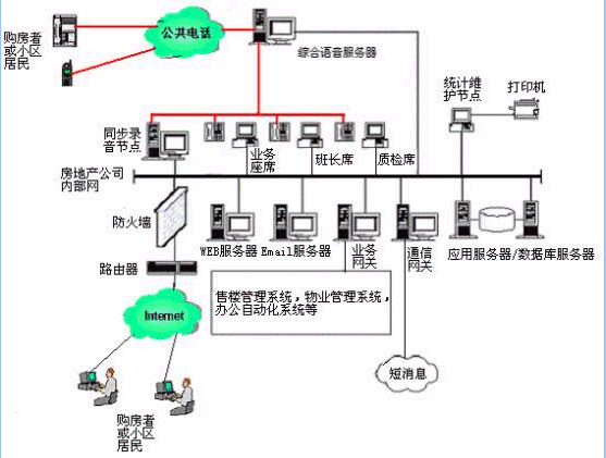 。。用戶利用電話、傳真、WEB、手機(jī)短信息、電子郵件等撥打某一特服號(hào)碼(如95xxx)進(jìn)入房地產(chǎn)多媒體客戶服務(wù)中心系統(tǒng),本系統(tǒng)依托房地產(chǎn)企業(yè)各類業(yè)務(wù)技術(shù)支持系統(tǒng),通過人工受理或自動(dòng)語音服務(wù)等方式為各類客戶提供購(gòu)房和物業(yè)管理服務(wù);形成了對(duì)外服務(wù)于客戶,對(duì)內(nèi)管理、分析、決策系統(tǒng)相結(jié)合的呼叫中心。