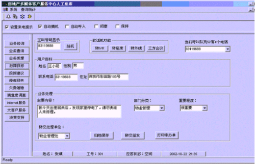 。。接通呼叫中心的電話后,按語音提示選擇相應(yīng)的服務(wù),選擇相應(yīng)的服務(wù)功能鍵后,在服務(wù)人員的計(jì)算機(jī)屏幕上自動(dòng)彈出對(duì)話框顯示用戶的詳細(xì)信息。