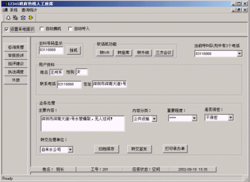 系統(tǒng)提供強大的信息資料處理功能,座席可記錄舉報、投訴、批評、建議等記錄單,將信息資料歸檔保存、打印受理單或?qū)⑹芾韱蔚任募D(zhuǎn)交簽發(fā)相關(guān)政府職能部門;系統(tǒng)引入CRM(Customer