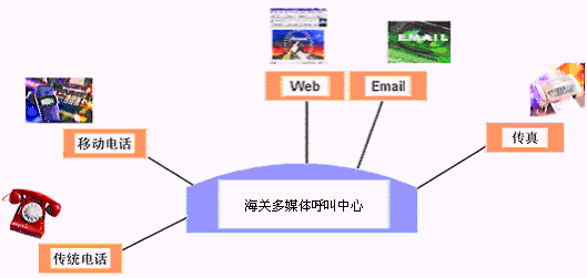 客戶利用電話、傳真、電子郵件、因特網(wǎng)、手機(jī)等撥打某一特服號(hào)碼(如9xxxx)進(jìn)入海關(guān)多媒體呼叫中心系統(tǒng),本系統(tǒng)依托海關(guān)緝私相關(guān)的MIS系統(tǒng)、OA度系統(tǒng)等各類業(yè)務(wù)技術(shù)支持系統(tǒng)和網(wǎng)絡(luò)系統(tǒng),通過(guò)自動(dòng)語(yǔ)音服務(wù)或人工受理等方式全天24小時(shí)不間斷地為客戶提供各種服務(wù)。