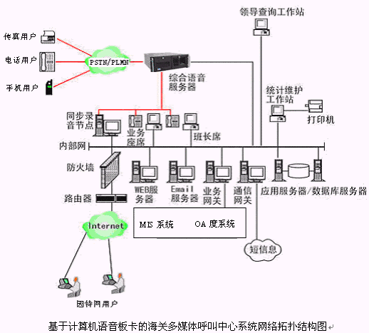 本多媒體呼叫中心的物理結(jié)構(gòu)由帶語(yǔ)音板卡的高工控機(jī)、CTI服務(wù)器、IVR(交互式語(yǔ)音應(yīng)答)/IFR(交互式傳真應(yīng)答)服務(wù)器、業(yè)務(wù)代表座席(邏輯上分為:普通業(yè)務(wù)代表座席、專家座席、WEB座席等)、班長(zhǎng)座席/質(zhì)檢座席、統(tǒng)計(jì)維護(hù)管理工作站、因特網(wǎng)(WEB)服務(wù)器、電子郵件(EMAIL)服務(wù)器、數(shù)據(jù)庫(kù)/應(yīng)用服務(wù)器、錄音留言工作站、領(lǐng)導(dǎo)查詢工作站、業(yè)務(wù)網(wǎng)關(guān)服務(wù)器、通信網(wǎng)關(guān)服務(wù)器、網(wǎng)絡(luò)系統(tǒng)等和應(yīng)用軟件構(gòu)成。