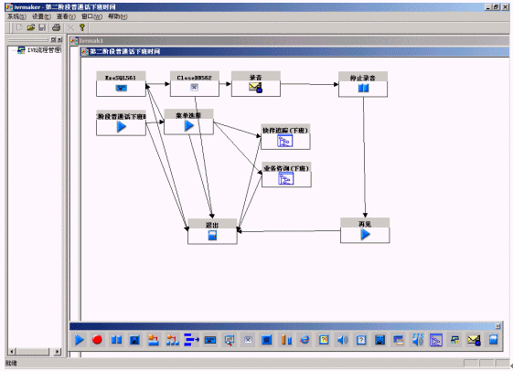 系統(tǒng)提供圖形化的語音流程生成環(huán)境,以方便用戶對語音流層進行定制。流程生成器是一套可視化的流程設計工具,通過拖拉圖標控件、鼠標連線即實現(xiàn)呼叫中心CTI流程的制作,同時,通過運行時鏈接動態(tài)連接庫(DLL),實現(xiàn)對業(yè)務數(shù)據(jù)庫的訪問;通過運行時鏈接用戶DLL,最靈活地與用戶應用系統(tǒng)結合;支持多種業(yè)務集成和動態(tài)流程控制,方便用戶拓展業(yè)務;采用事件驅(qū)動機制、開放的結構,滿足各種語音系統(tǒng)的需要;支持不限個數(shù)、級數(shù)的IVR結構,可滿足用戶非常復雜的需求。
