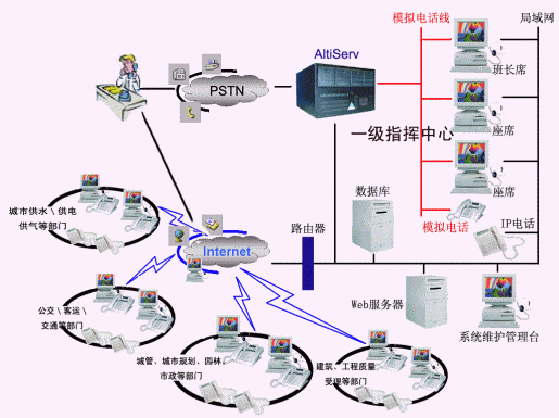 在建設(shè)12319時(shí),將整個(gè)熱線系統(tǒng)構(gòu)架分成三級(jí)網(wǎng)絡(luò)結(jié)構(gòu),一級(jí)網(wǎng)絡(luò)指揮中心為城市提供了一個(gè)電子化(語(yǔ)音、Internet等)的服務(wù)窗口,它是以12319作為電話接入的系統(tǒng)號(hào)碼,幫助城市改善傳統(tǒng)的服務(wù)方式,為市民提供多種渠道和政府進(jìn)行溝通,該級(jí)系統(tǒng)建立在奧迪堅(jiān)AltiServ平臺(tái)之上,采用多路并發(fā)IVR自動(dòng)語(yǔ)音應(yīng)答資源,各城市可以進(jìn)行依據(jù)自己的需要進(jìn)行個(gè)性化的IVR應(yīng)用,為用戶提供人工接聽及語(yǔ)音自助服務(wù)。除此之外,在一級(jí)網(wǎng)絡(luò)指揮系統(tǒng),AltiServ的IP分布式呼叫中心平臺(tái)還提供一系列先進(jìn)功能,其中包括:自動(dòng)話務(wù)分配、VoIP功能、語(yǔ)音信箱、文本轉(zhuǎn)語(yǔ)音(TTS)、電話會(huì)議、錄音管理、CDR(通話詳細(xì)報(bào)告)等,方便指揮中心集中受理群眾建議,發(fā)布指令以及發(fā)揮監(jiān)督等作用。