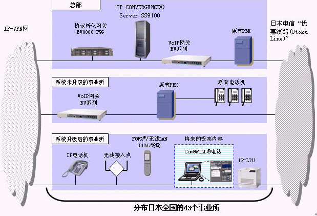 CONVERGENCE® Server SS9100(以下簡稱SS9100)"為基礎(chǔ)的IP Centrex系統(tǒng)(注1)。預(yù)計在2007年構(gòu)筑完成連接其分布日本全國各地的43個事業(yè)所的企業(yè)內(nèi)部IP