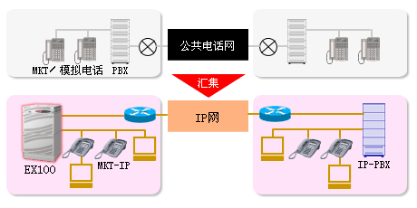 各事業(yè)所的系統(tǒng)利用IP網(wǎng),可以作為設(shè)置在總部等地的EX100的內(nèi)線使用。因此,不僅不需要在各事業(yè)所設(shè)置PBX/業(yè)務(wù)電話設(shè)備,而且在小型事業(yè)所也可以應(yīng)用業(yè)務(wù)電話設(shè)備無法提供的PBX服務(wù)功能。