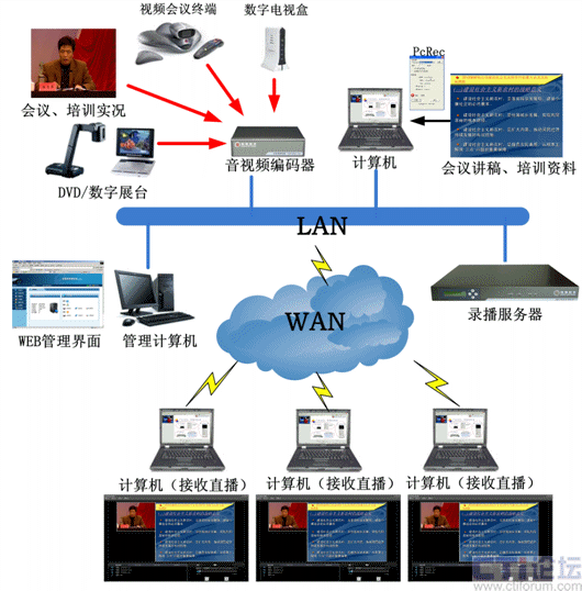 如上圖所示,會易錄采用前后臺分離模式,前臺設備(視音頻編碼器、數(shù)據(jù)編碼器)負責信號采集;后臺設備(多媒體錄播服務器)負責信號處理。前后臺設備之間通過IP網(wǎng)絡進行通訊。上述編碼器可將采集到的視音頻信號和計算機屏幕信號編碼后通過網(wǎng)絡發(fā)送到后臺的多媒體錄播服務器,多媒體錄播服務器可將收到的視音頻信號和計算機屏幕信號進行同步一體化的錄制、直播、點播。