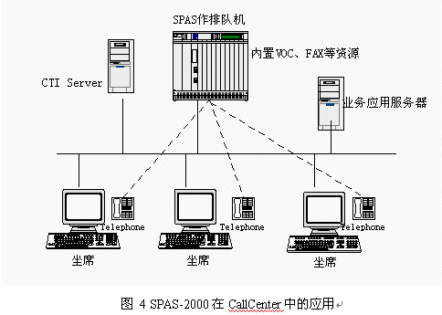 目前國(guó)內(nèi)呼叫中心的建設(shè)方興未艾,企業(yè)為了改善服務(wù),贏得客戶,紛紛建設(shè)自身的呼叫中心。如果建立呼叫中心全部采用國(guó)外設(shè)備,價(jià)格非常昂貴,使很多客戶望而卻步。這樣大的投資目前也只有電信(包括移動(dòng)和聯(lián)通)、電力、銀行等資金充裕的行業(yè)才能承受。而且,根據(jù)我方了解,即使這些行業(yè)也在控制采購成本,原先只注重名牌,不計(jì)成本的情況正在改變。而在目前宏觀經(jīng)濟(jì)形勢(shì)不景氣的大背景下,大中型企業(yè)既要加快企業(yè)信息化建設(shè),保住客戶,降低成本,又要精打細(xì)算,規(guī)避投資風(fēng)險(xiǎn)。我們掌握建立呼叫中心設(shè)備的所有核心技術(shù),因此在呼叫中心應(yīng)用方面有很大的價(jià)格優(yōu)勢(shì),這樣就降低了擁有呼叫中心的門檻,在這個(gè)市場(chǎng)上也有很強(qiáng)的競(jìng)爭(zhēng)力。采用SPAS-2000可編程交換機(jī)支持智能業(yè)務(wù)通用編程接口,可以作為CallCenter核心設(shè)備,應(yīng)用圖見圖4: