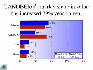 TANDBERG視頻會議終端產(chǎn)品是挪威泰德集團(TANDBERG Group)下屬視訊公司(TANDBERG Telecom)的定位于高端市場的視頻會議系統(tǒng)終端產(chǎn)品,亦就是說,TANDBERG終端是挪威泰德公司專為出錢要買最好終端的客戶們設(shè)計、生產(chǎn)和制造的。TANDBERG未在挪威以外設(shè)立任何分廠,每臺設(shè)備必須經(jīng)過挪威工程師嚴(yán)格檢驗,從而保證每臺設(shè)備的最高可靠性(當(dāng)然海關(guān)進口成本要高一些了)。TANDBERG全系列產(chǎn)品均采用泰德自己研發(fā)的專用視頻芯片,而不是采用第三方芯片加以集成,從而保證了從高端T8000至低端T500的所有產(chǎn)品性能表現(xiàn)均很優(yōu)秀。