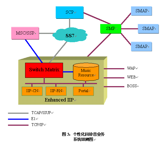 個(gè)性化回鈴音業(yè)務(wù)是基于智能網(wǎng)平臺(tái)實(shí)現(xiàn)的全新增值智能業(yè)務(wù),采用被叫簽約信息T-CSI觸發(fā)的方式。具體實(shí)現(xiàn)時(shí)利用現(xiàn)有智能網(wǎng)結(jié)構(gòu),將業(yè)務(wù)邏輯加載在SCP上,MSC/SSP根據(jù)用戶的歸屬HLR中的T-CSI信息,觸發(fā)智能業(yè)務(wù)到用戶歸屬的SCP上,并進(jìn)行相應(yīng)的業(yè)務(wù)控制處理。在呼叫過程中,由SCP控制獨(dú)立IP,向用戶提供音樂回鈴音。其中的Switch