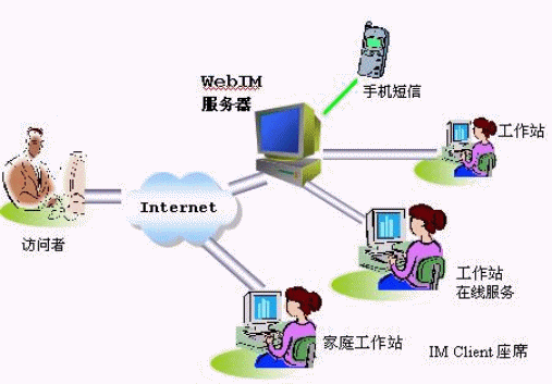 系統(tǒng)由IM SERVER、IM CLIENT和WEB鏈接小程序組成,當(dāng)WEB訪問(wèn)者點(diǎn)擊直接交談按鈕后,和呼叫中心一樣,系統(tǒng)會(huì)查找企業(yè)內(nèi)部的一個(gè)已登錄坐席,并為他和訪問(wèn)者建立一個(gè)對(duì)話窗口,如果沒(méi)有已登錄坐席,則可以提醒訪問(wèn)者留言,并可通過(guò)短信通知企業(yè)人員。和其他企業(yè)級(jí)IM不同的是,