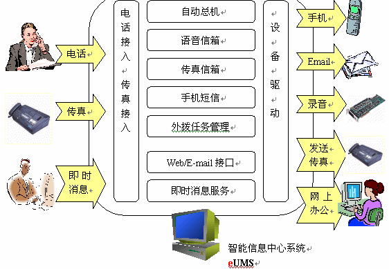整個系統(tǒng)以eUMS服務(wù)器為核心,對內(nèi)連接企業(yè)局域網(wǎng),對外連接互聯(lián)網(wǎng)。eUMS內(nèi)配置一塊語音/傳真卡,負(fù)責(zé)電話、傳真的接入。如果企業(yè)需要自己的短信服務(wù),也可以在eUMS服務(wù)器上安裝手機(jī)短信網(wǎng)關(guān),外接一部手機(jī)即可。
