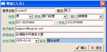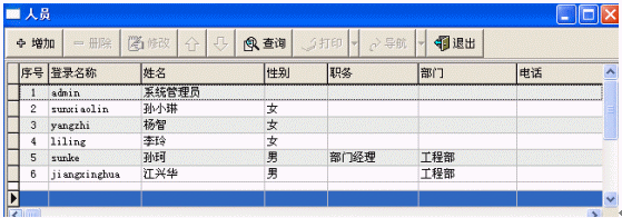 人員管理主要是對本系統(tǒng)的使用者進行管理(增加/修改/刪除/查詢),包括使用者所在的部門、職務(wù)等