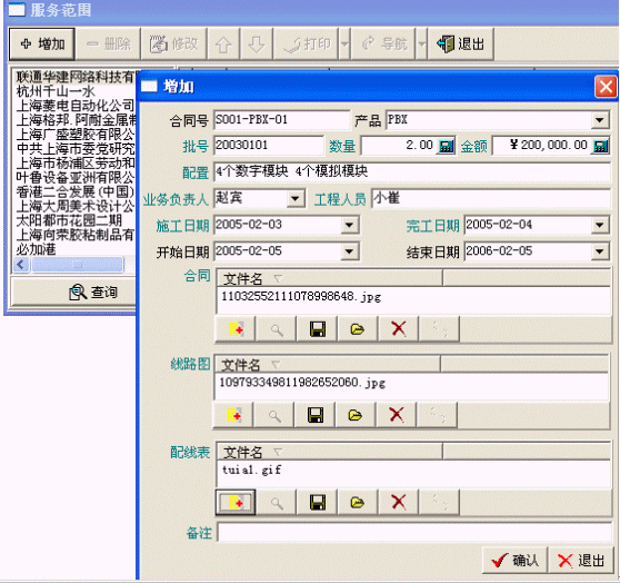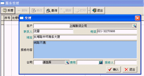 主要登記產(chǎn)品信息、客戶信息、服務(wù)合同、售后服務(wù)卡,接受客戶的投訴或請求,進行派工和派工的跟蹤。