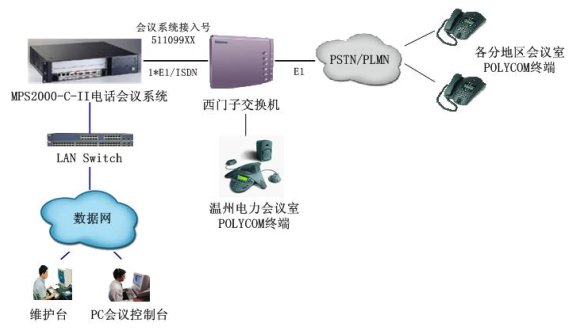 MPS2000-C電話會(huì)議系統(tǒng)通過(guò)數(shù)字中繼(采用ISDN信令)與溫州電力原有的西門(mén)子交換機(jī)互聯(lián),作為會(huì)議應(yīng)用服務(wù)器,為溫州電力原有電話網(wǎng)絡(luò)內(nèi)的用戶提供電話會(huì)議功能。