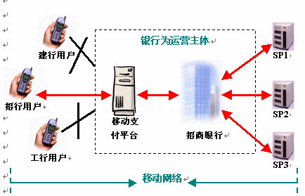 銀行通過專線與移動運營商進行系統(tǒng)接入,用戶通過銀行卡賬戶進行移動支付,或者將銀行賬戶與手機賬戶綁定。銀行為用戶提供交易平臺和付款途徑,移動運營商業(yè)只為銀行和用戶提供信息通道,而不參與支付過程。