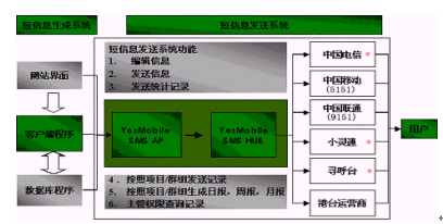 ·由YesMobile提供Api程序包,用戶按照技術(shù)規(guī)范開發(fā)Web或客戶端程序完成接入,通過(guò)YesMobile的短信平臺(tái)向用戶指定客戶發(fā)送信息;