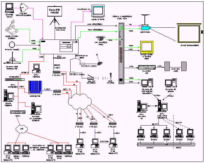1、 電視會議系統(tǒng)包括一臺MCU和13臺iPower900,通過IP網(wǎng)絡(luò)和E1專線兩種線路連接。為了將視頻會議的功能進(jìn)行擴(kuò)展,我們增加了多種外圍設(shè)備,包括:實(shí)物投影儀、白板掃描儀、無線話筒、DV31攝像機(jī)等輸入設(shè)備,彩色電視機(jī)、三菱投影機(jī)和功放、音箱等輸出設(shè)備以及8×4視頻切換矩陣。