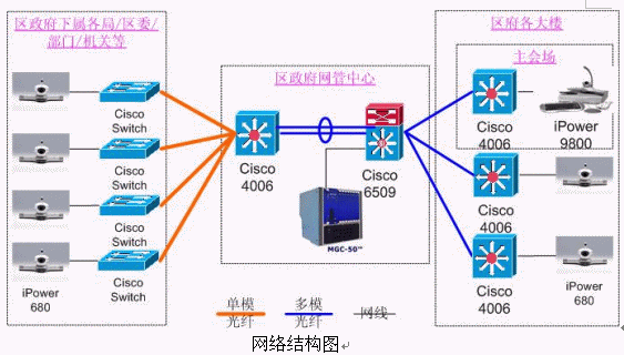 9800,分會(huì)場(chǎng)使用iPower 680。網(wǎng)管中心安放一臺(tái)Polycom 公司的MGC-50(多點(diǎn)會(huì)議控制單元),用于對(duì)全網(wǎng)終端的控制,實(shí)現(xiàn)多點(diǎn)間、點(diǎn)對(duì)點(diǎn)會(huì)議。各視頻設(shè)備通過(guò)網(wǎng)線連接在各主要交換機(jī)上。