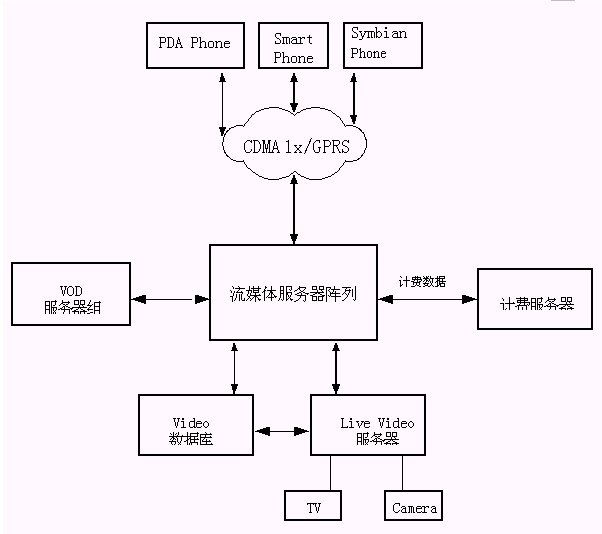 根據(jù)中國2.5網(wǎng)絡(luò)的特點(diǎn),結(jié)合我們自身的技術(shù)和系統(tǒng)解決方案的優(yōu)勢(shì),我們針對(duì)CDMA1X網(wǎng)絡(luò)推出了移動(dòng)VOD,增強(qiáng)型移動(dòng)視頻郵件、移動(dòng)可視電話的系統(tǒng)解決方案。在GPRS網(wǎng)絡(luò)上則推出了移動(dòng)音頻點(diǎn)播業(yè)務(wù),移動(dòng)視頻郵件業(yè)務(wù)。下面我們對(duì)這些業(yè)務(wù)做具體描述。