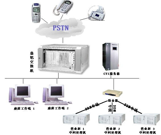 該系統(tǒng)由前端機(jī)鼎銘PBX、CTI服務(wù)器、中間處理機(jī)、座席客戶(hù)端組成(見(jiàn)附圖)。