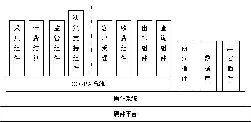 長話計費系統(tǒng)既包括計費結(jié)算系統(tǒng),又包括營業(yè)服務(wù)系統(tǒng),功能比較多,數(shù)據(jù)處理流程也相對復(fù)雜。 簡單的傳統(tǒng)數(shù)據(jù)庫的機械化編程已很難滿足系統(tǒng)對大數(shù)據(jù)量的處理及靈活性等方面的要求,因此在這套系統(tǒng)中,我們采用了一些當(dāng)今業(yè)界的熱門技術(shù)。比如采用了CORBA軟總線思想和MQ Series消息管理隊列,也使之成為聯(lián)機計費系統(tǒng)平臺的一次成功實施。其系統(tǒng)層次結(jié)構(gòu)圖如下: