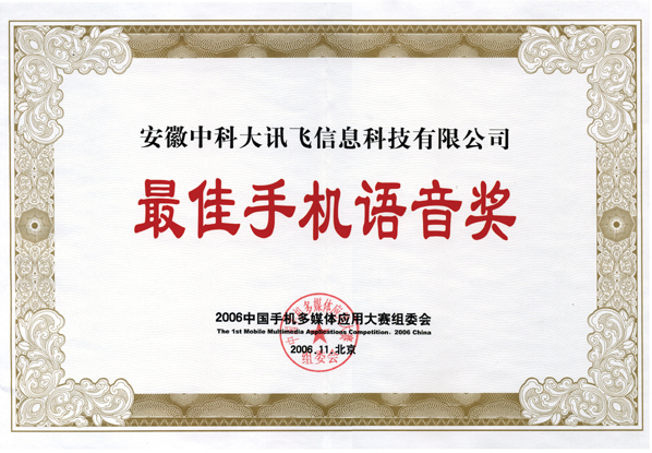 近日,首屆中國(guó)手機(jī)多媒體應(yīng)用大賽組委會(huì)將“2006最佳手機(jī)語(yǔ)音獎(jiǎng)”這份沉甸甸的獎(jiǎng)牌和證書(shū)授予了科大訊飛。這一由數(shù)十位業(yè)界專(zhuān)家和百萬(wàn)手機(jī)用戶慎重評(píng)選出的獎(jiǎng)項(xiàng),充分說(shuō)明了科大訊飛在手機(jī)語(yǔ)音應(yīng)用領(lǐng)域的領(lǐng)先地位,其分量不言而喻。