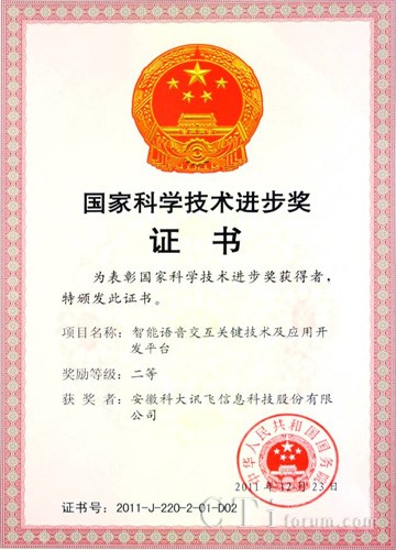 CTI論壇(ctiforum)2月20日消息(記者 浩宇):2月14日,2011年度國(guó)家科學(xué)技術(shù)獎(jiǎng)勵(lì)大會(huì)在北京隆重舉行,黨和國(guó)家領(lǐng)導(dǎo)人胡錦濤、溫家寶、李長(zhǎng)春、李克強(qiáng)出席大會(huì)并為獲獎(jiǎng)代表頒獎(jiǎng)。由科大訊飛和中國(guó)科學(xué)技術(shù)大學(xué)聯(lián)合提交的“智能語(yǔ)音交互關(guān)鍵技術(shù)及應(yīng)用開發(fā)平臺(tái)”項(xiàng)目榮獲國(guó)家科技進(jìn)步二等獎(jiǎng),在本年度信息化領(lǐng)域(計(jì)算機(jī)與自動(dòng)控制、通信、現(xiàn)代服務(wù)業(yè)信息化等專業(yè)組)一等獎(jiǎng)空缺的情況下,該項(xiàng)目在計(jì)算機(jī)與自動(dòng)控制專業(yè)組所有項(xiàng)目中排名第一。這是科大訊飛第二次獲得這一國(guó)家獎(jiǎng)重大榮譽(yù),也是語(yǔ)音產(chǎn)業(yè)界唯一獲此殊榮的企業(yè)。