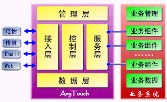 AnyTouch不僅僅是一個面向應用開發(fā)商、系統(tǒng)集成商的CTI中間件產品,而且提供支持最終用戶自我維護、開發(fā)、編輯的業(yè)務接口與開發(fā)工具包;贏nyTouch,可以根據不同的行業(yè)需求開發(fā)出不同的業(yè)務應用系統(tǒng),從而構筑屬于自己的呼叫中心、企業(yè)增值服務、通訊服務、信息服務及CRM系統(tǒng)。
