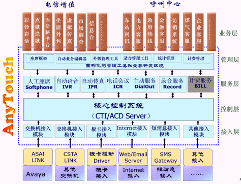 佳訊飛鴻近十年來(lái)一直致力于建設(shè)國(guó)內(nèi)一流的呼叫中心系統(tǒng)和電信增值業(yè)務(wù),其CTI方面的主打產(chǎn)品AnyTouch平臺(tái)廣泛應(yīng)用到電信、鐵路、軍隊(duì)、郵政、媒體、政府、電力、金融和商業(yè)等多個(gè)行業(yè)的呼叫中心、客服中心、CRM、電子商務(wù)和信息化平臺(tái)項(xiàng)目建設(shè)中。AnyTouch平臺(tái)是融合呼叫中心和電信增值業(yè)務(wù)的CTI應(yīng)用產(chǎn)品,是一個(gè)綜合的、集成的開(kāi)發(fā)工具。她能夠構(gòu)建各種熱線電話系統(tǒng)、客戶服務(wù)系統(tǒng)、企業(yè)服務(wù)中心等呼叫中心業(yè)務(wù);同時(shí)可生成彩話、點(diǎn)歌、固話秘書(shū)臺(tái)、信息臺(tái)等電信增值業(yè)務(wù)。
