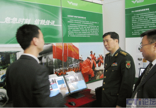圖為:解放軍總參謀部應(yīng)急辦公室主任田義祥大校參觀佳訊展臺(tái)