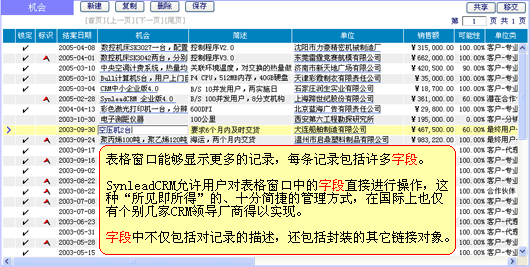 上圖"機(jī)會(huì)管理"表格窗口進(jìn)一步對(duì)人本化的管理方法進(jìn)行了舉例。在這里,您可直接對(duì)瀏覽到的字段進(jìn)行交互(是否能夠新建、修改、刪除,受管理授權(quán)或默認(rèn)授權(quán)約束),而不必一定要轉(zhuǎn)到另外的窗口才可操作字段。該方法在SynleadCRM中處處存在,它不僅僅為了提高工作效率,更讓企業(yè)在推行CRM管理變革時(shí)襯托出靈活性,而不是帶來(lái)了僵化。