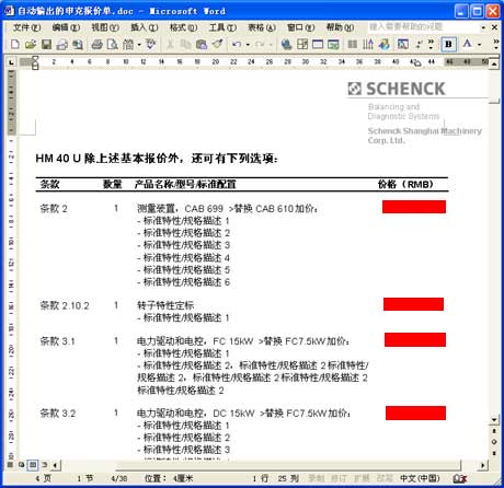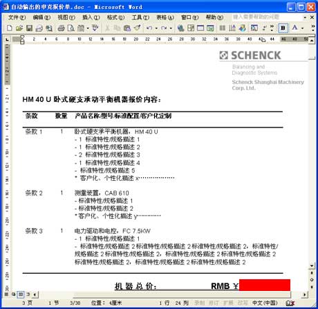 以上海申克的報價單為例。與其說它是一份報價單,不如說它是一套幾十頁的客戶化復(fù)雜方案書,它由各方面數(shù)據(jù)和文檔自動合并、輸出為一份Word文件: