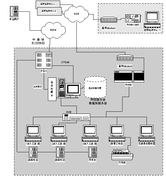北京強(qiáng)訊恒通網(wǎng)絡(luò)技術(shù)公司通過(guò)利用該學(xué)院現(xiàn)有的計(jì)算機(jī)局域網(wǎng),根據(jù)該學(xué)院業(yè)務(wù)需求專門(mén)為800服務(wù)熱線設(shè)立了一組服務(wù)座席,每個(gè)座席都有座席電腦。所有撥打800熱線的電話通過(guò)CTI服務(wù)器的ACD系統(tǒng)分配到服務(wù)組最適合的座席。如該服務(wù)組暫時(shí)沒(méi)有空閑座席,則語(yǔ)音提示用戶等待并播放音樂(lè),一旦有座席空閑則自動(dòng)將該用戶電話轉(zhuǎn)接到空閑座席。當(dāng)有外線進(jìn)來(lái)接通到某個(gè)座席時(shí),系統(tǒng)自動(dòng)彈出該電話用戶的客戶資料。