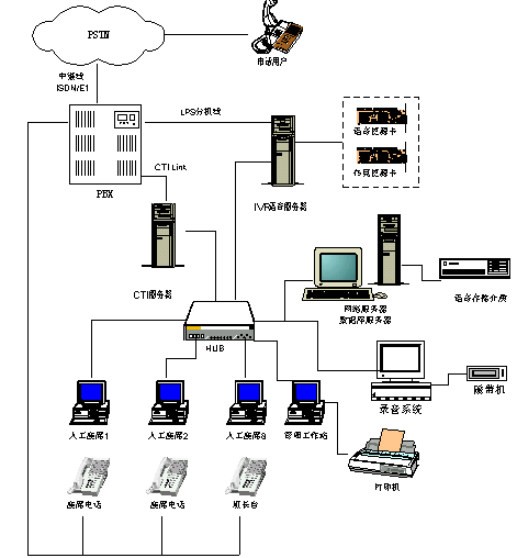 Server)是呼叫中心的核心部件,它通過(guò)交換機(jī)的CTI Link獲取交換機(jī)的狀態(tài)并實(shí)現(xiàn)對(duì)交換機(jī)的通信。它是一個(gè)將計(jì)算機(jī)網(wǎng)絡(luò)與電話網(wǎng)緊密聯(lián)系的紐帶。CTI服務(wù)器部份包括CTI服務(wù)器(工控機(jī)/服務(wù)器)、UltraCTI呼叫控制模塊、CallMonitor呼叫管理/監(jiān)控/統(tǒng)計(jì)模塊、UltraCDR呼叫數(shù)據(jù)記錄模塊。