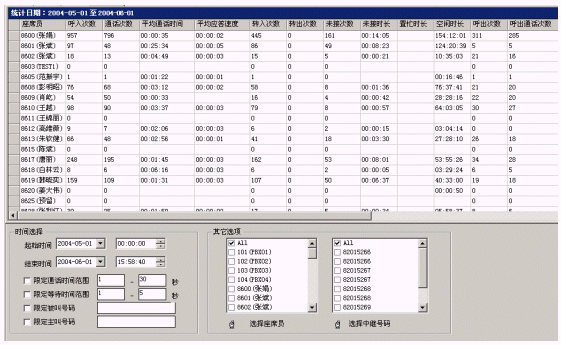 呼叫統(tǒng)計(jì)是呼叫中心最重要的功能。該呼叫中心系統(tǒng)設(shè)計(jì)了一整套豐富的呼叫統(tǒng)計(jì)管理工具,能有效地實(shí)現(xiàn)對(duì)業(yè)務(wù)、設(shè)備、人員的全面管理,使呼叫中心隨著運(yùn)營(yíng)的過(guò)程效益不斷地提高。同時(shí)提供實(shí)時(shí)的監(jiān)控工具,使管理人員及時(shí)了解整個(gè)系統(tǒng)的運(yùn)行狀態(tài)。
