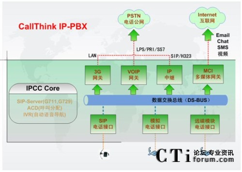 IPCC Core是IP-PBX的核心部分,提供了配置IP分機號碼(Extension Number)、功能按鈕以及通話管理和ACD路由策略功能;它可以支持多達1000個IP語音終端呼叫請求,通過分組交換,實現(xiàn)IP分機、普通分機、互聯(lián)網(wǎng)上IP電話之間的互聯(lián)互通;通過Voip網(wǎng)關,可以實現(xiàn)IP網(wǎng)絡和傳統(tǒng)電路交換電話網(wǎng)的通信,完成異種網(wǎng)絡的電話呼入和呼出;