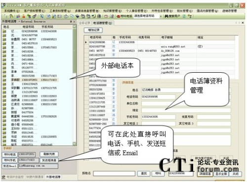 其所有資料顯示在主界面右側的“外部電話本”中。在轉發(fā)工單等功能中也將使用外部電話簿資料。如圖所示: