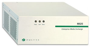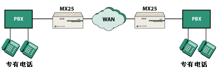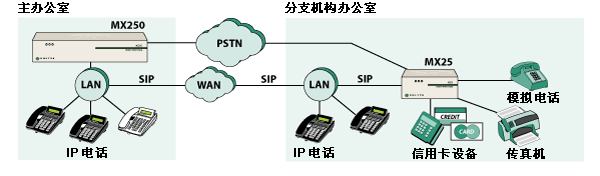 MX25 是一種能夠在兩種不同模式下工作的模塊化設(shè)備。在其中一種工作模式下,MX25 是一個(gè)通向 PSTN 網(wǎng)關(guān)的獨(dú)立 SIP。當(dāng)在這種模式下工作時(shí),MX25 轉(zhuǎn)換電話呼叫的格式,使其可以在 IP 網(wǎng)絡(luò)與公用電話網(wǎng)絡(luò)之間傳遞。另一種工作模式是,將 MX25 作為 MX250 的功能延伸系統(tǒng),用于不超過 25 個(gè)用戶的分支辦公室。在這種配置下,MX25 與 MX250 通信并交換有關(guān)用戶和設(shè)備的信息。即使連接 MX250 和 MX25 的 WAN 鏈路出現(xiàn)故障,MX25 也能繼續(xù)工作并處理來自/發(fā)往 PSTN 的傳入/傳出呼叫。