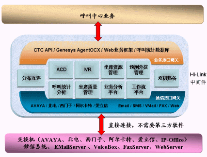 Hi-Link核心控制層包括以下幾個(gè)部分:ACD、IVR、呼叫統(tǒng)計(jì)分析、呼叫監(jiān)控管理、坐席質(zhì)量管理、系統(tǒng)配置管理、預(yù)測(cè)外撥管理、業(yè)務(wù)分析平臺(tái)、雙機(jī)熱備機(jī)制、分布互連機(jī)制、工作流平臺(tái)。