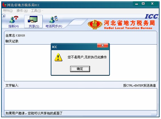 7. 遠程共享:考慮到對納稅人電腦的安全保護,座席端沒有權利主動共享納稅人的桌面,即坐席不能點擊共享按鈕,如果點擊,將彈出對話框友好提示:“您不是納稅人,無權執(zhí)行此操作”如下圖: