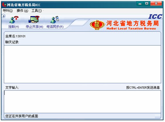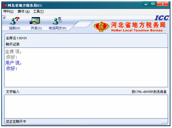 輸入文字信息后按CTRL+ENTER就可發(fā)送消息。輸入的文字可以在 ICC界面上面的聊天記錄對話框中顯示,同時發(fā)送給納稅人。如下圖: