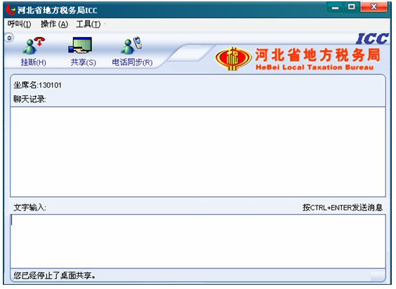 如有納稅人點擊共享按鈕,坐席的共享按鈕變?yōu)橥V构蚕戆粹o,并且左下角的狀態(tài)欄文字提示變?yōu)椤澳诠蚕碛脩舻淖烂妗,如下圖: