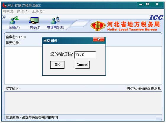 坐席只需通過電話將此框中的驗證碼(比如圖例中的1982驗證碼)告訴和坐席通話的納稅人。然后點擊OK按鈕。納稅人端得到坐席告訴他的驗證碼后,納稅人端也有個電話同步按鈕,納稅人點擊并輸入坐席告訴他的驗證碼后,坐席就可以看到有呼叫進來。此呼叫就是正和坐席通話納稅人的ICC呼叫。坐席點擊應答后就可以和此納稅人ICC