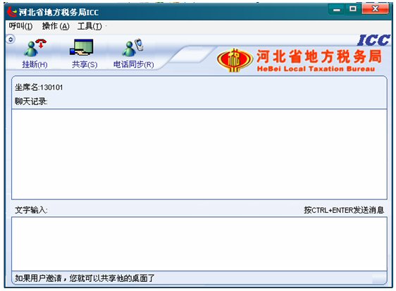 收到納稅人共享請求提示,如果坐席現(xiàn)在為全屏,收到納稅人共享請求,ICC界面將會自動跳到全屏的前端,彈出共享框。如果坐席現(xiàn)在不是全屏,收到納稅人共享請求,任務欄里ICC對話框?qū)⒆詣娱W爍,彈出共享框。