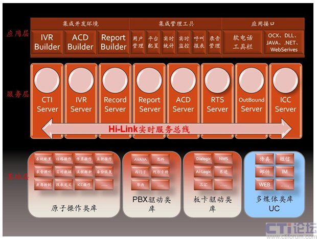 在擁有第五代呼叫中心Hi-Link核心軟件的商路通公司看來,呼叫中心軟件架構(gòu)包含三層,基礎(chǔ)層、服務(wù)層和應(yīng)用層。而統(tǒng)一通信UC應(yīng)從劃入基礎(chǔ)層及服務(wù)層之中,PBX驅(qū)動(dòng)類庫和板卡驅(qū)動(dòng)類庫處理電話媒體的請(qǐng)求,而多媒體類庫用于處理其他統(tǒng)一通信的媒體,如傳真、短信、電子郵件、均包含在多媒體類庫之中。傳真、短信、電子郵件等請(qǐng)求分別由FAX