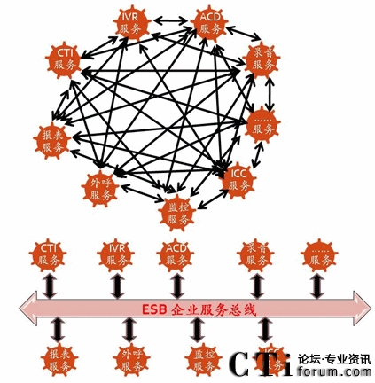 簡(jiǎn)單一點(diǎn),下面兩種構(gòu)架的方式,第一種,雜亂無(wú)章,第二種,非常清晰,第二種用的就是ESB的方式。