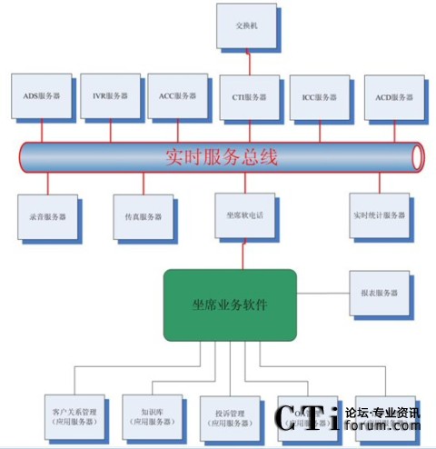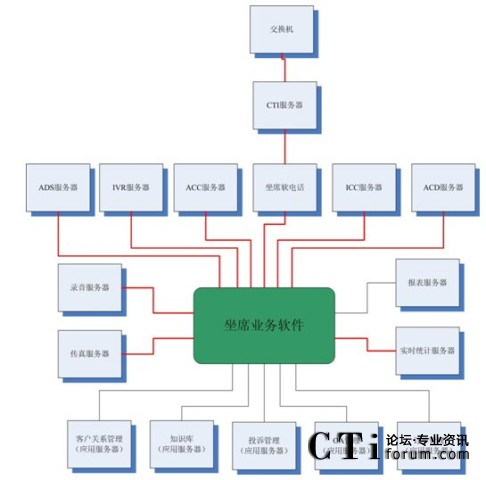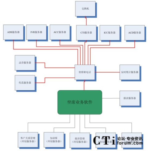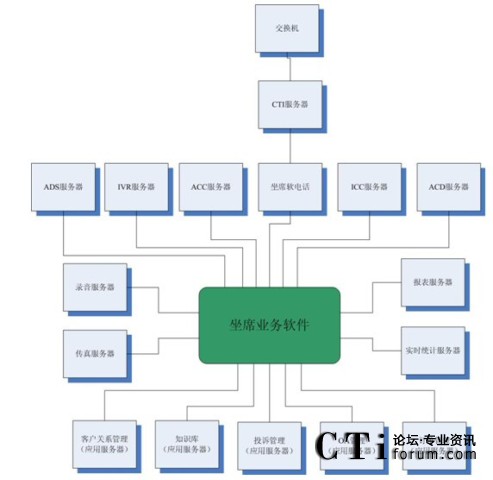 很多集成商或業(yè)務軟件開發(fā)商認為這種結構過于復雜,而他們自身往往提供“整體解決方案”,即所有的服務器軟件基本上都是自己的,根據客戶的要求修改即可。例如,客戶關系管理、知識庫、投訴管理、OA、訂單管理以及坐席軟電話、ADS服務器、IVR服務器、ACC服務器、ICC服務器、ACD服務器、錄音服務器、傳真服務器、報表服務器、實時統(tǒng)計服務器都是自己來做,那么對于很多接口環(huán)節(jié)都可以節(jié)省了。